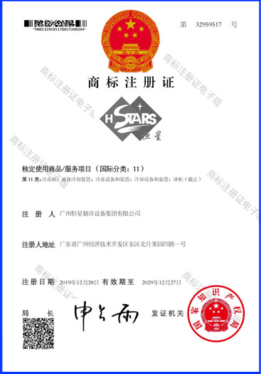 近日,廣州恒星制冷設(shè)備集團(tuán)有限公司收到國家知識產(chǎn)權(quán)局頒發(fā)的恒星組合式商標(biāo)注冊證。本次商標(biāo)注冊申請為“恒星+HSTARS+圖形(星星)”組合。使用產(chǎn)品/服務(wù)項(xiàng)目(國際分類:11)涵蓋5大類,標(biāo)志著廣州恒星制冷設(shè)備集團(tuán)有限公司在品牌建設(shè)方面取得了里程碑的成果。